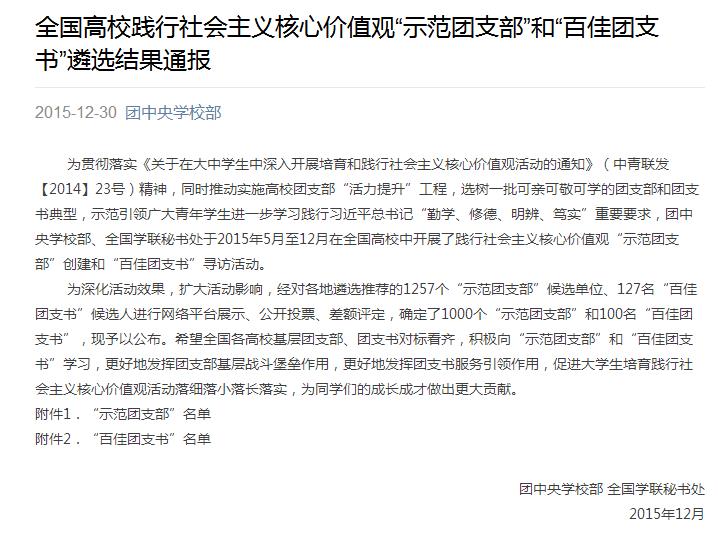 2015年5月至12月,为推动实施高校团支部“活力提升”工程,选树一批可亲可敬可学的团支部和团支书典型,示范引领广大青年学生进一步学习践行习近平总书记“勤学、修德、明辨、笃实”重要要求,团中央学校部、全国学联秘书处在全国高校中开展了践行社会主义核心价值观“示范团支部”创建活动。通过对各地推荐的1257个“示范团支部”进行遴选、展示、公开投票、差额评定、审核,我院贸经1302班团支部被授予国家级“示范团支部”荣誉...