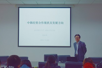 禹辰勋教授从中韩经贸25年的回顾与现状出发,用曲线图的形式,生动地展示了“中韩的贸易动向”、“中韩对主要国家的进出口情况”、“韩国对中国的贸易收支动向”以及“中韩两国的投资趋势”,使大家对中韩贸易的历史有了清晰的认识,明白了在经济全球化的浪潮下,贸易合作与交流是国家经济发展的一个必不可少的因素,中韩在贸易中的优势互补,极大的促进了双方的经济增长。 随后,禹教授立足未来,阐述了中韩贸易的发展趋势,使同学们对中韩经贸的发展有了更进一步的认识,中韩贸易的不断发展,正是基于产业的优势互补,合理引导各自产业的良性发展,才能为接下来的贸易合作打下良好的基础。