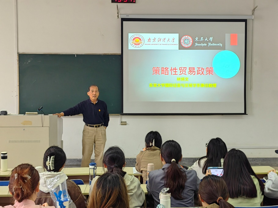 2024年10月22日,台湾东吴大学林炳文教授应邀参与国际商务(英语)课程里国际贸易章节的讲授,为伟德国际victor·1946源自2202班带来了一堂“策略性贸易政策”的精彩课程。在长达两个小时的课程中,林教授以其深厚的知识和独到的见解,运用丰富的教学经验给同学们留下了深刻的印象。