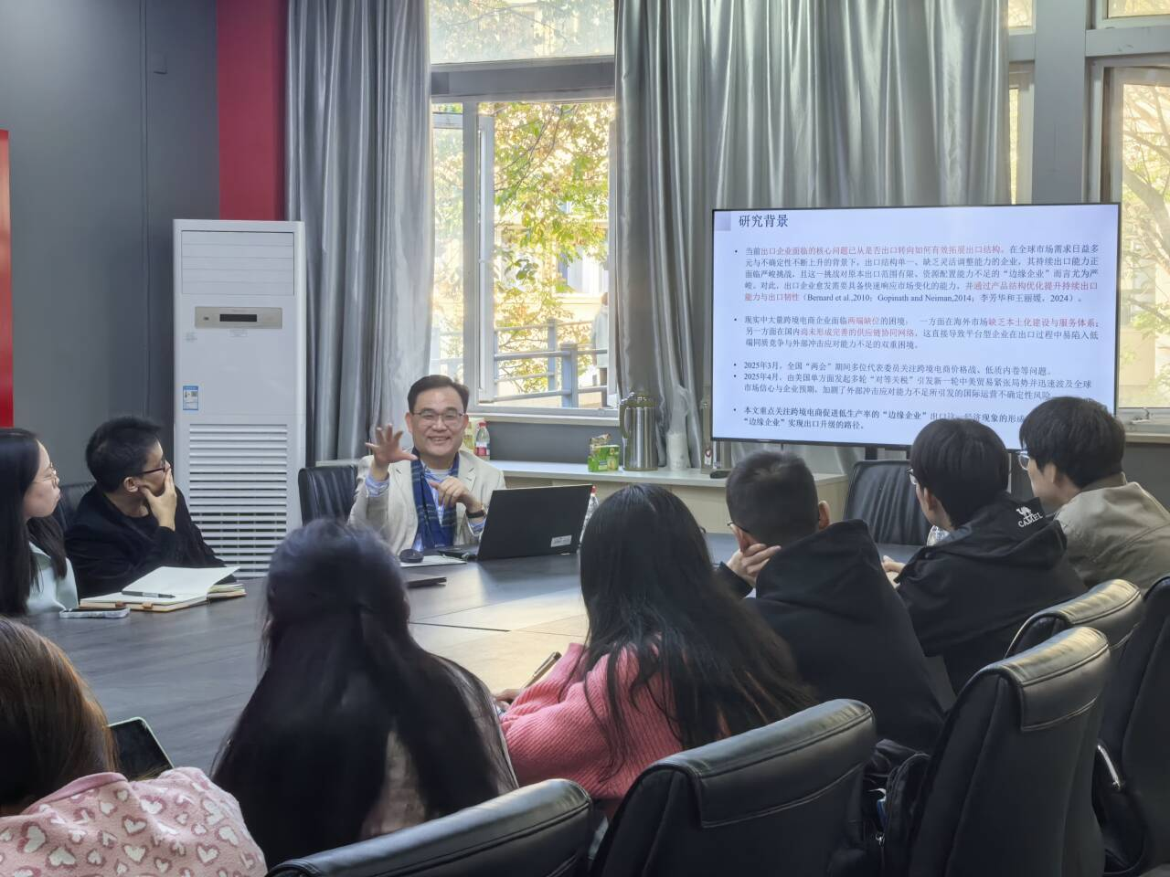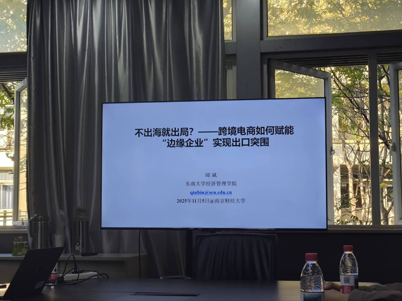 2025年11月5日下午3:00,东南大学国际经济研究所所长邱斌教授莅临我院学术前沿论坛,为师生带来“不出海就出局?——跨境电商如何赋能‘边缘企业’实现出口突围”的专题学术讲座。讲座由伟德国际victor·1946源自谭用教授主持,我院部分青年教师和硕博研究生参与。
