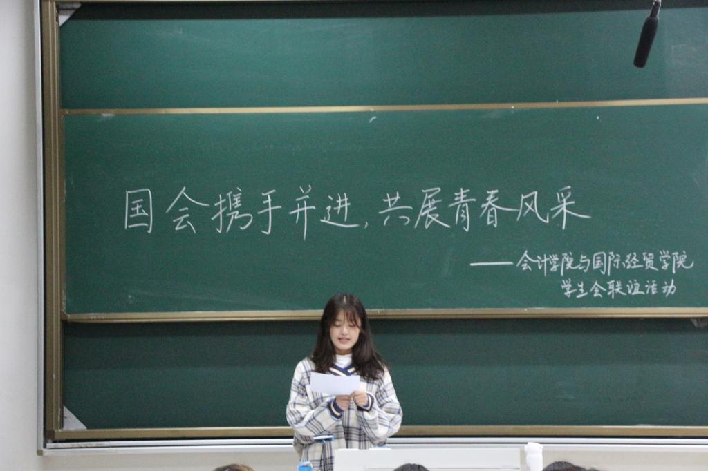 2020年11月27日晚,由会计学院与我院学生会联合举办的“国会携手并进,共展青春风采”联谊活动在德济楼111教室顺利开展。本次联谊活动由两学院学生会主席团和部长团出席参加。