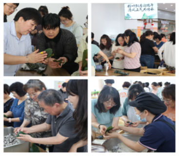 随后,在食堂师傅娴熟如行云流水的示范指导下,师生们一起动手包粽。“掌心空、手指松、糯米实、叶子牢”,大家边摸索边体会,不时还交流一下各种粽子包法的不同。翻卷粽叶、轻放食材、反复裹紧、缠牢棉绳......,每一个的粽子成形,都迎来了成功的欢呼和品评的惊叹。摇头点头间,喜悦逐渐爬上了眉梢。现场忙碌欢乐的景象,温馨而热烈。