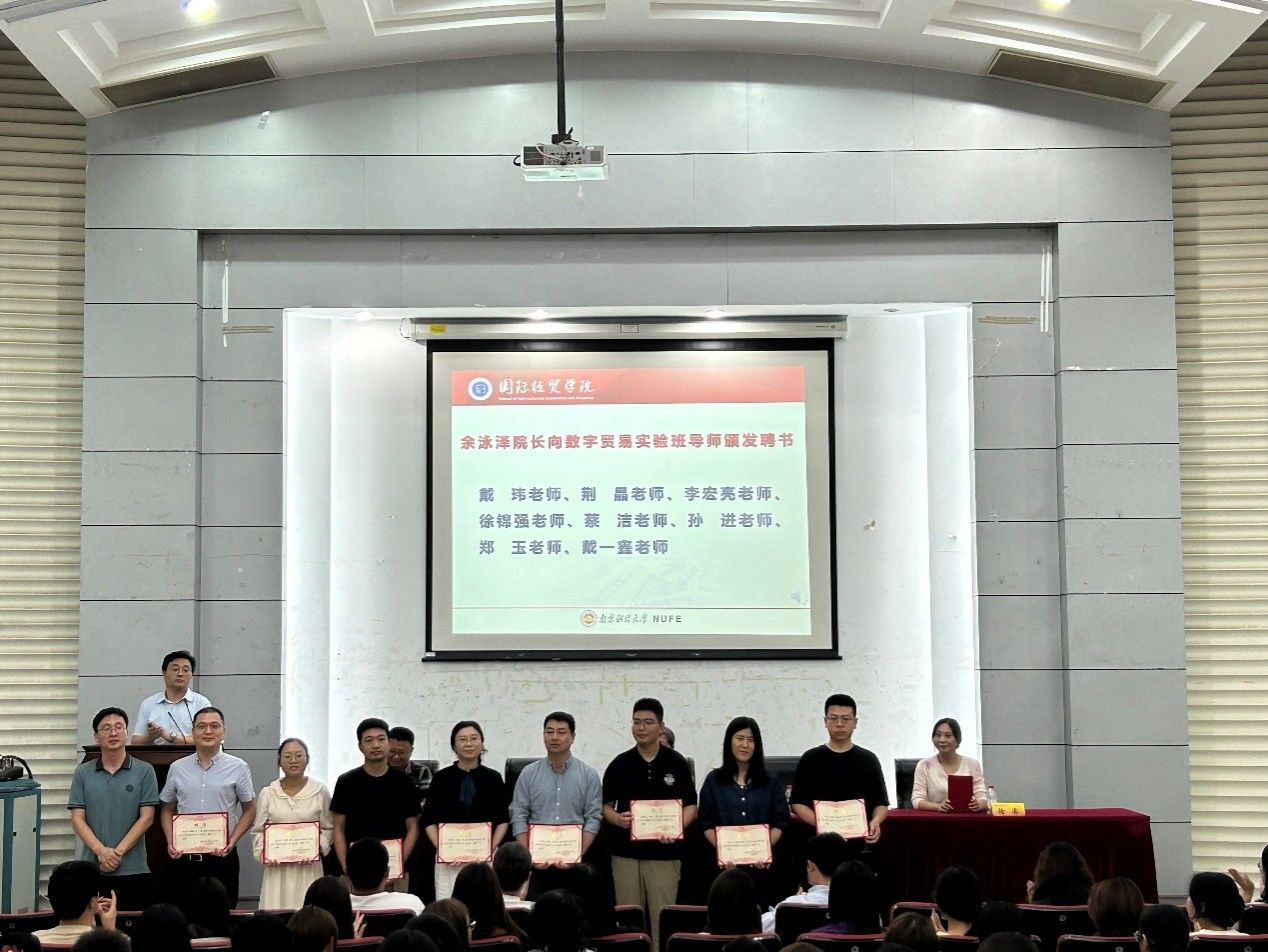 典礼现场举行了新生班主任和数字贸易实验班导师聘书颁授仪式。周亚芳书记向10位新生班主任颁发了聘书,余永泽院长向8名数字贸易实验班导师颁发了聘书。