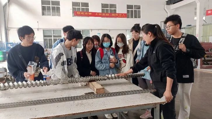 抵达欣沃公司后,负责人Gina带领同学们到车间进行了参观。塑料制品在生活中随处可见,但在这里,同学们亲眼见到了双螺旋挤出机的具体工作流程,见证了塑料原料的生产。通过Gina的详细介绍,同学们对平行同向双螺杆挤出机和不同的牵引磨合机有了更多的认识,大大开阔了同学们的视野。