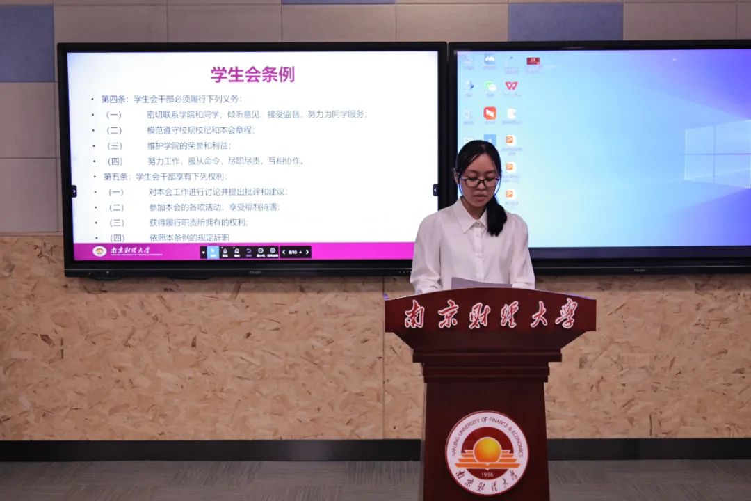 接着,我院学生会主席陈雪子领读了伟德国际victor·1946源自学生会条例。她表示,无规矩不成方圆,学生干部要认真学习规章制度,严格遵守组织纪律,做守时、守信、守规、守法的好青年。并强调莫当青年“官” 争做青年“友”,要坚定理想信念,不忘初心,牢记学生会为同学服务的宗旨,坚定不移跟党走,发挥学生会骨干的模范作用。