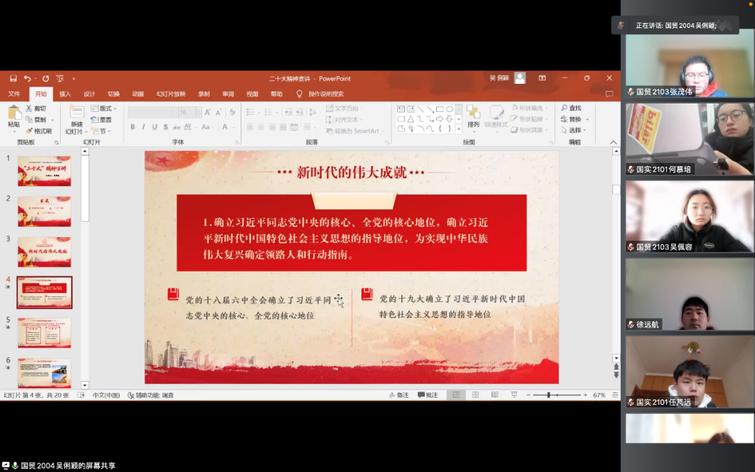 1月9日,党的二十大精神师生宣讲团成员国贸2004的吴俐颖同学从新时代的伟大成就、深入学习宣传贯彻党的二十大精神、新时代新要求新标准三个方面入手,号召我院青马班成员深入学习贯彻党的二十大精神。