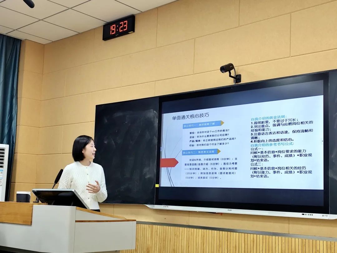 其次是国实2201王若辰,获国家奖学金、第十四届“挑战杯”全国大学生课外学术科技作品校特等奖,曾担任国家级大创项目第一主持人。她从校招面试新形势、单面通关核心技巧、面试分类三个方面进行阐述,表示做好前期技巧、熟悉常见流程是作为面试者必须掌握的信息。她还介绍了对于认知类、动机类、能力类面试题型的应对方法,针对群面常见角色及职能,她表示总结陈述者要以集体为重,不随意删减讨论结果,同时注意时间把控和表达上的逻辑清晰、流畅。