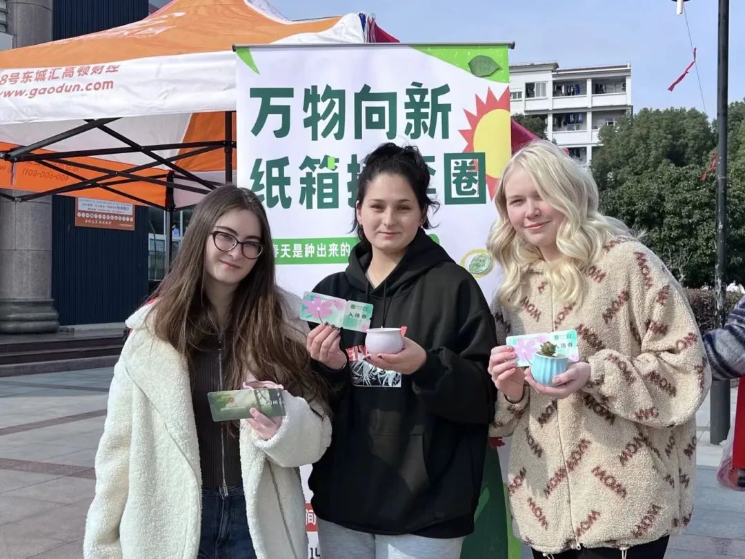 春生万物,“植”此青绿。此次活动以套圈游戏的形式吸引同学们用闲置纸质用品换取美丽盆栽。活动开始不久,同学们便手持快递盒、外卖纸盒、书籍等前往志愿活动现场换取套圈。在志愿者的引导下,同学们迫不及待的站在了起始线前,鞠躬弯腰投掷、单眼瞄准飞跃式投掷、扎马步式求稳投掷......每当有人成功套中盆栽,现场都会爆发出热烈的掌声和欢呼声。国实2301班的徐天一同学认真地说:“现代物流发展迅速,虽便利但也产生了不少闲置快递盒,这次活动不仅能帮助我很好的处理闲置纸制品,更是帮助我深刻认识到保护树木、珍惜纸资源的重要性。”