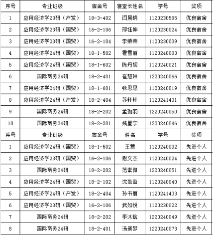 此次宿舍文化评比活动,参选的宿舍卫生普遍较好,通风良好,被褥衣物叠放整齐,地面、桌面整齐干净,用电安全。经过多个维度综合评分,最终评选出了 “优良宿舍”10个,“先进个人”8名。