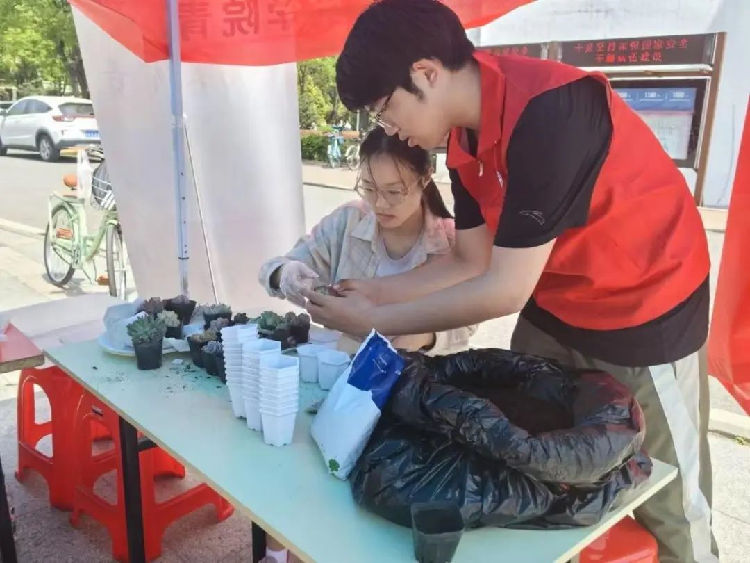 咖啡渣种植项目同样人气高涨。咖啡渣富含氮元素,与营养土按照1:3的比例混合,便是培育多肉植物的优质培养基。活动中,同学们在容器底部铺上一层石头,以增强排水性能,随后倒入适量的咖啡渣与营养土混合基质。接着,大家轻轻拿起多肉幼苗,将其根部小心地埋入基质中,再用小铲子轻轻覆盖周围土壤,完成种植。看着亲手种在咖啡渣中的多肉植物,同学们眼中满是期待,仿佛看到了绿色生活的美好未来。