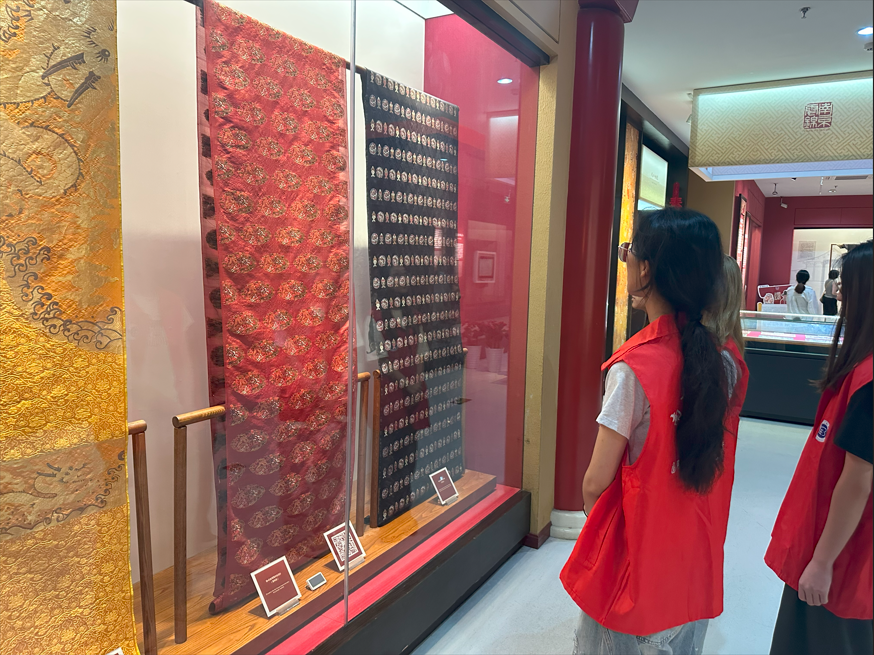 展厅内,一件件云锦作品以其独特的光泽和细腻的纹理,向团队成员们诉说着跨越千年的故事。团队成员们在专业讲解员的细致解说下,对云锦在中国文化中的重要地位有了更加系统的认识。通过近距离观赏云锦展品,学生们不仅对云锦的精湛工艺有了直观的感受,更对这一传统工艺背后的文化和历史价值有了深刻的理解。云锦的每一寸织物都蕴含着无数工匠的智慧和心血,是中华民族文化宝库中的瑰宝。