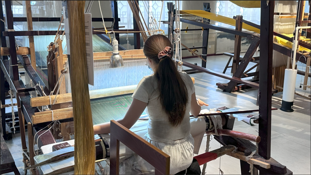 通过近距离观察大花楼木织机的织造过程,队员们对云锦的精湛工艺和独特艺术风格有了直观的感受。木机高四米,两人一上一下,一分钟仅织出1厘米。隔着安全线,屏息凝视:梭影翻飞,一寸锦一寸心,古人千锤百炼的匠心此刻具象化。
