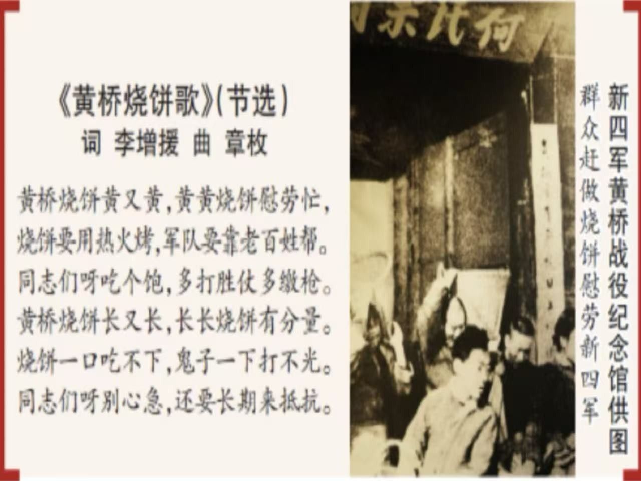 “烧饼传递的不仅是食物,更是民心。”团队成员感慨道。战役期间,黄桥镇呈现“家家无闲人,户户做烧饼”的壮景:老人揉面、妇女烧水、儿童捡柴,青壮年穿越火线送饼。一首黄桥烧饼歌由此诞生:“黄桥烧饼黄又黄,黄黄的烧饼慰劳忙,烧饼要用热火烤,军队要靠老百姓帮。同志们呀吃得饱,多打胜仗多缴枪”,歌词道出了军民鱼水情的真谛。新四军战士捧着百姓手制的烧饼,士气大振,最终以少胜多,奠定了苏北抗日根据地的基础。