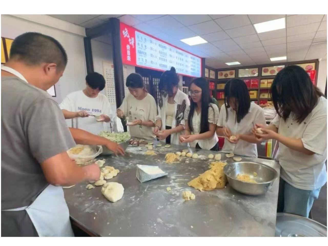 走出黄桥战役纪念馆,那些与黄桥烧饼相关的展品仍在眼前浮现,百姓支援前线的场景仿佛就在昨日。为了更真切地感受那段军民同心的岁月,团队成员们来到当地的烧饼工坊,亲手体验黄桥烧饼的制作。在烧饼店内,团队成员们在张师傅的指导下,和面、制酥、包馅,每个人制作二十个烧饼。揉进面团的不仅是馅料,更是一份沉甸甸的红色记忆。