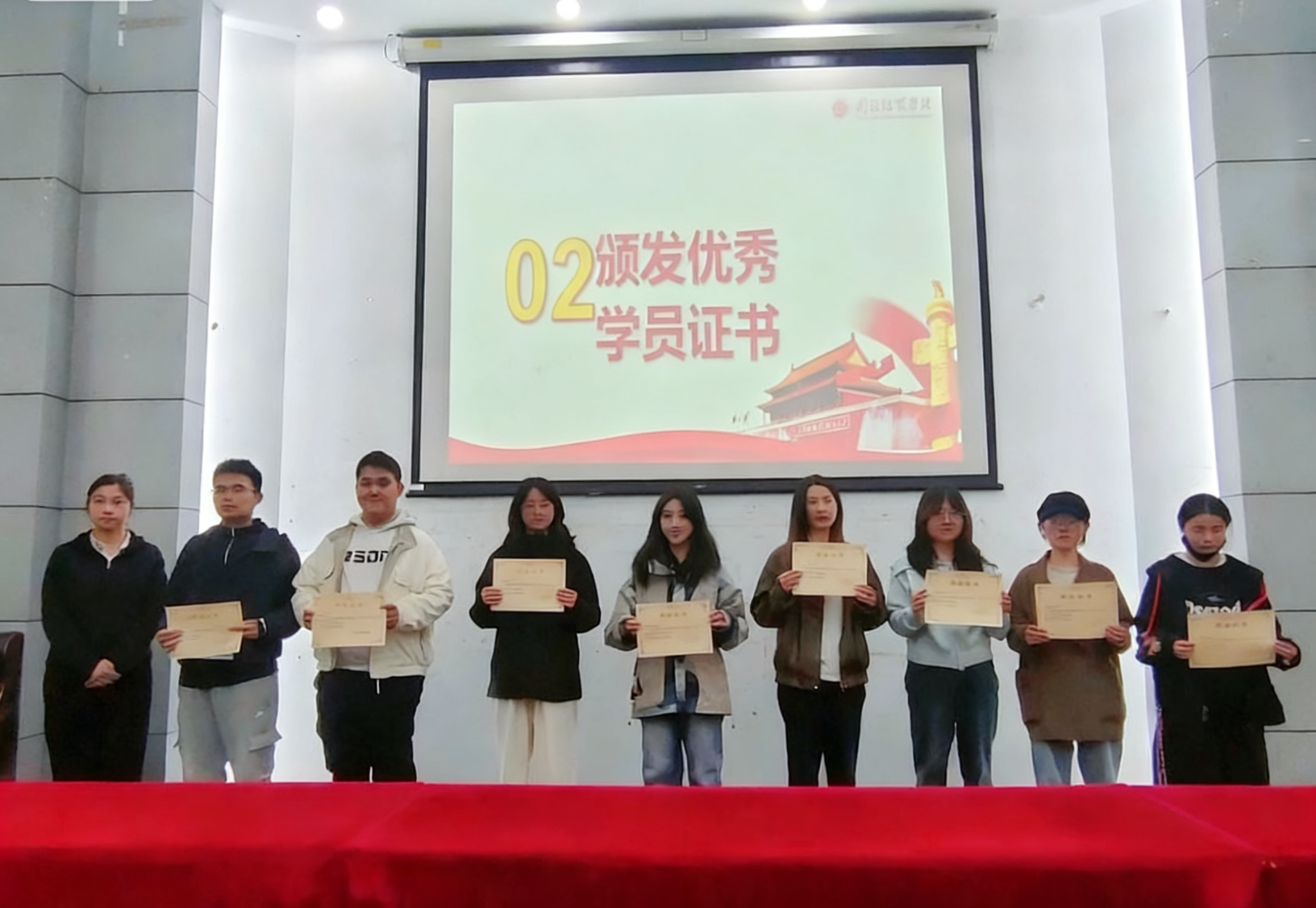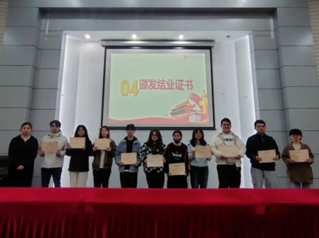 随后,仪式进入颁发结业证书环节,各组学员代表上台,分团委副书记范晶晶颁发结业证书。
