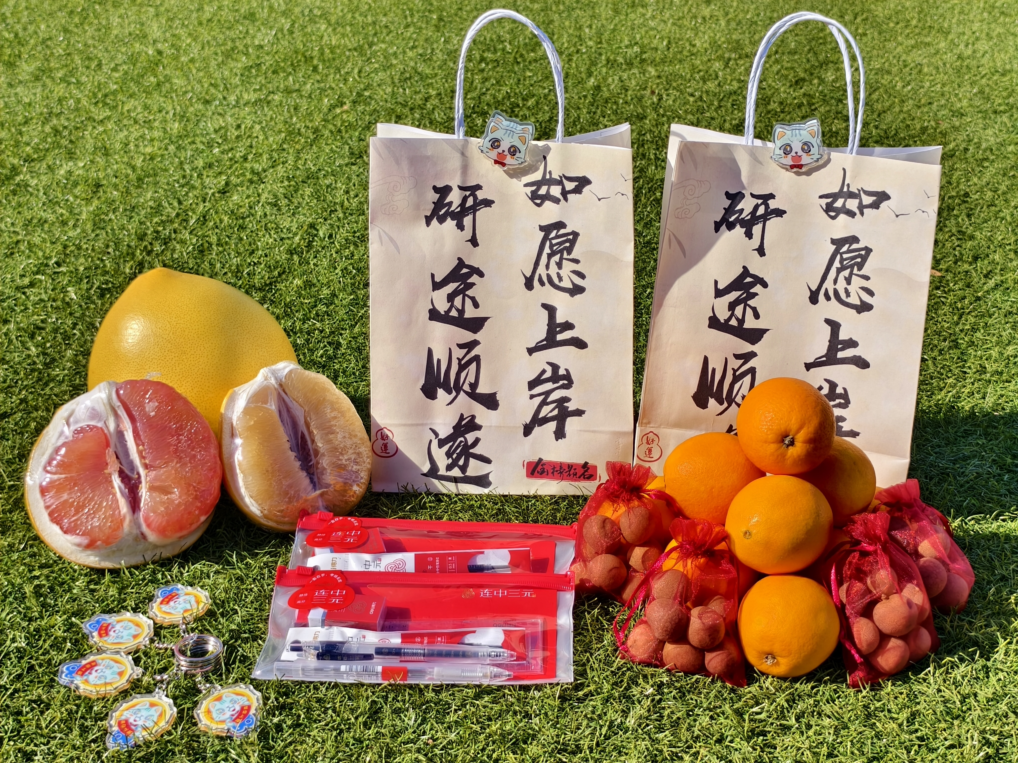这份饱含心意的“上岸福袋”暗藏巧思:精心挑选的考试专用文具套装确保答题顺畅,刻有学院标识的定制钥匙扣寓意前程似锦,色泽鲜亮的橙子象征“成功上岸”,清甜爽口的柚子祝福“又见喜报”,果肉饱满的桂圆寄托“蟾宫折桂”的美好祝愿。从物资采购到分类打包,全程由志愿者们亲手完成,指尖传递的不仅是沉甸甸的物资,更是“薪火相传”的鼓励与守望。“接过福袋,心里暖暖的,感觉压力都减轻了一点。”国贸2204的考研同学罗光照说道。