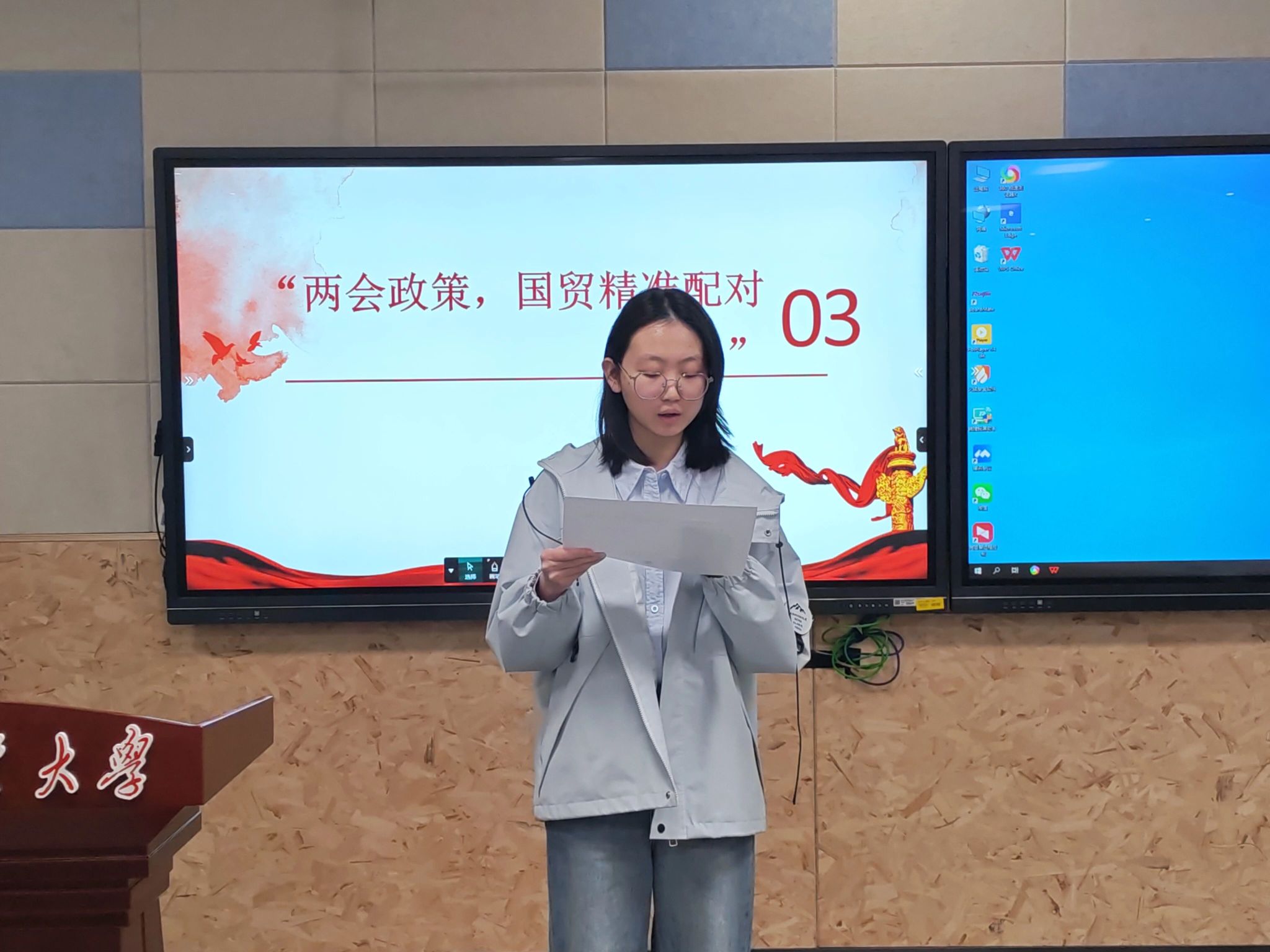 在“两会资讯,研学共读”环节,现场通过影像与文本结合的方式,开展沉浸式两会学习。精选的两会新闻视频、重要讲话片段,让学子们直观感受国家在新发展阶段的宏观布局;同步研读的两会权威简报、热词新词,则聚焦AI与就业、智能经济与商贸转型等核心议题,引导大家探讨如何调整知识结构以适配智能经济发展需求。当“人工智能相关人才缺口超500万”“青年就业支持体系持续完善”等两会民生关切与专业发展关联起来,学子们深刻认识到,国家对青年就业的“贴身关怀”,正是大家深耕专业、锤炼本领的底气。