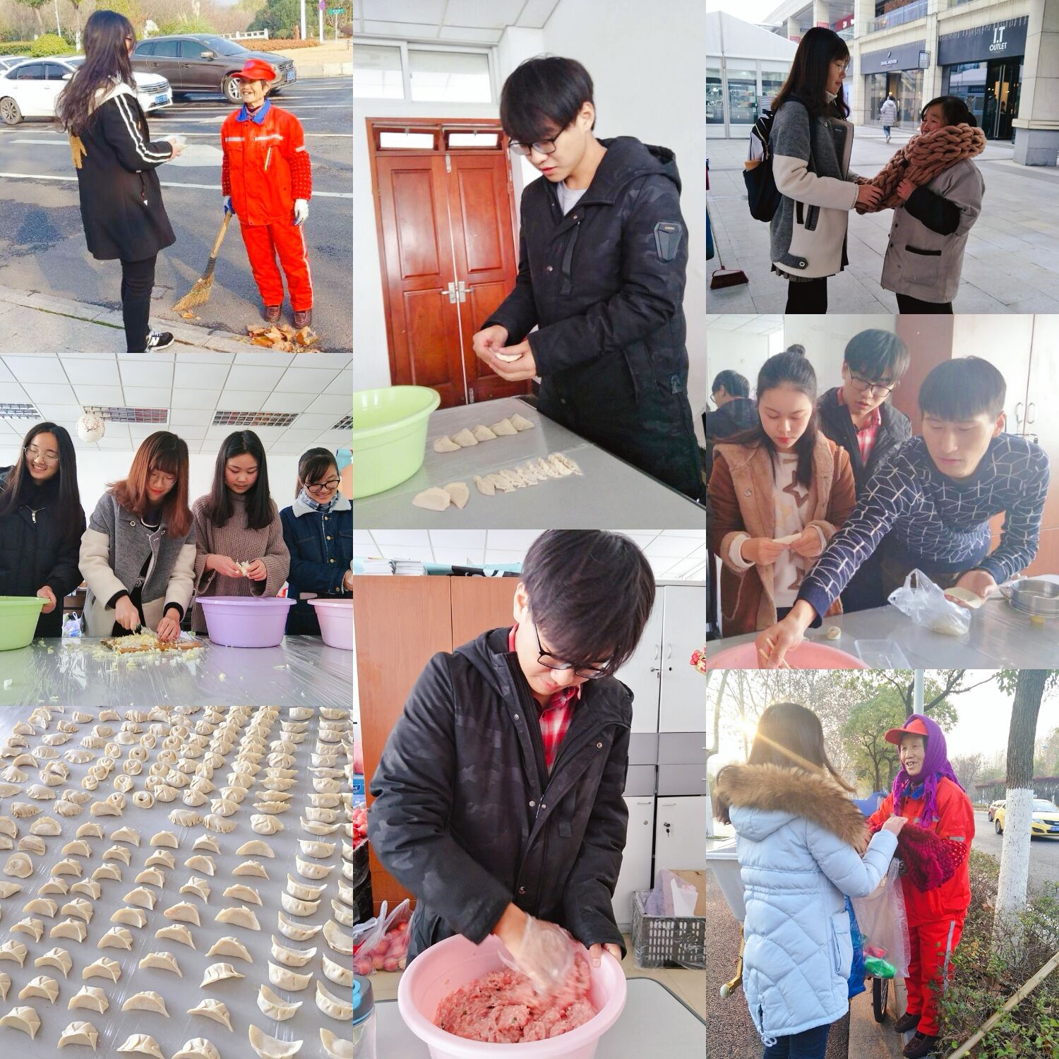 饺子包好后,大家将饺子拿到食堂进行加工烹饪,新鲜的饺子出炉后,大家将热气腾腾的饺子送到了学校内外寒风中工作的环卫工人们手上,并且为他们带去了自己亲手织的围巾。参与织围巾陆忆同学说:“天太冷了,叔叔阿姨们都是在寒风中工作,我们想亲手给他们传递一些温暖。”负责活动组织的胡孙雯同学表示:“情感大都隐藏在内心深处,唯独就缺少一个打开的缺口。作为当代的大学生,我们应该向社会传播正能量和爱,多做一些有意义的事情,让寒冷的冬天温暖起来。”