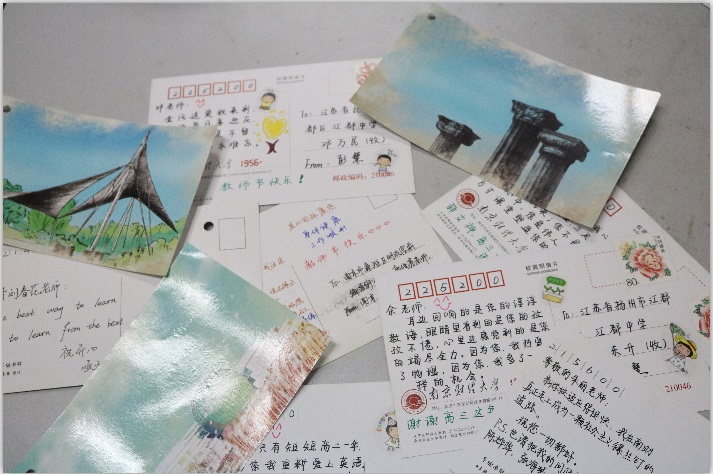 “尊敬的朱丽老师:新学校适应得挺快,我在南财真正走上成为一颗社会主义螺丝钉的道路。祝您一切都好。”一位叫龚逸之的同学在明信片上如此写道。“恩师的存在就像是拥有一位成熟的朋友。”姚嘉茜同学说,“我要特别感谢高中的地理老师,是她启发了我学习的兴趣,明信片虽小,但是情谊沉甸甸的。”查同学在明信片上熟稔地称呼高中班主任老师为“男神”,他写道:“男神男神!欢迎来南京玩!带你飞!大学老师都没有你颜值高!哈哈,教师节快乐!”
