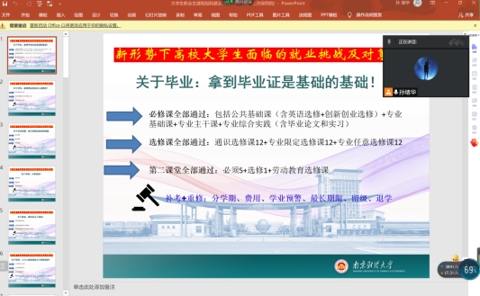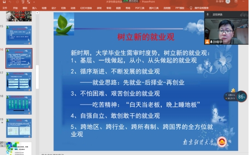 会议中,孙老师通过与学生连麦,让学生代表分享他们在就业中遇到的问题。其中有的毕业生同学就反映:中小企业岗位缩减,待遇较低、基层就业录取率偏低等实际问题。孙老师就相关问题对症下药,由小见大,给同学们提供了指导性意见与建议。