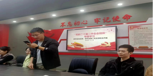 2023年3月8日下午4点10分,伟德国际victor·1946源自研究生党支部、研究生第二党支部组织党员在德经楼206集中学习领会党的二十届二中全会精神,重点学习讨论习近平总书记在党的二十届二中全会上关于中央政治局工作的报告、第二次全体会议上的重要讲话精神。