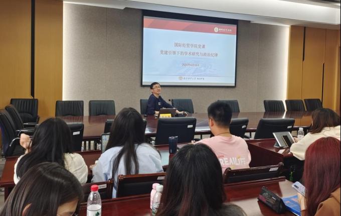 在谈及如何遵守学术活动的政治纪律时,余泳泽院长强调,加强党纪教育是落实全面从严治党要求、加强党的纪律建设的一项基础性、经常性工作。在学术活动中,一是要积极向党组织看齐;二是要努力学习党的重要纲领性文件;三是要日常关注有时效性的媒体平台;四是要主动学习党的重要会议精神。要求大家把握政治航向,自觉在思想上政治上行动上同党中央保持高度一致,推进在知识体系和信仰体系上的同步转化。