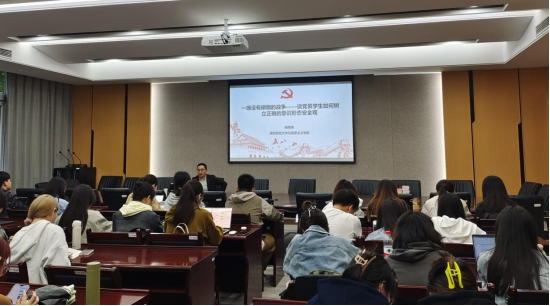 杨荣刚主任以“经济建设是党的中心工作,意识形态工作是党的一项极端重要的工作”引出主题内容,并通过国内外案例实践的生动讲述,引导在座学生深刻认识到了意识形态工作的重要性。随后,杨荣刚老师讲述了学生意识形态工作面临的形势和挑战,并强调了党员同学们应当增强政治意识,树立正确的意识形态安全观,不做任何危害国家安全的事情。