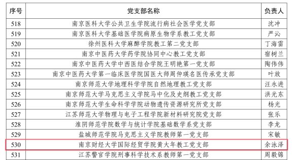 黄大年教工党支部作为第二批“全国党建工作样板支部”培育创建单位,支部书记由“333高层次人才培养工程”第二层次培养对象、国家社科基金重大项目首席专家、首批全国高校黄大年式教师团队成员余泳泽教授担任。支部始终坚持以习近平新时代中国特色社会主义思想为指导,坚持围绕校院事业发展中心大局抓党建、围绕服务区域重大战略需求抓党建,践行“学科专业支部一体化建设”党建工作模式,通过教学、协同、学习“三融合”机制引领,模式、队伍、平台“三位面”综合布局,资源、制度、示范“三同频”全力保障,聚力推进内涵建设和特色发展。支部拥有中宣部宣传思想文化青年英才(理论界)1人,江苏省有突出贡献的中青年专家、省青蓝工程中青年学术带头人、省优秀共产党员等称号9人次,培育出多名全国高校黄大年式教师团队成员、江苏省高校优秀共产党员等先进典型,支部成员获得省部级以上领导肯定性批示及被采纳成果21篇,为学院党委入选“全省党建工作标杆院系”培育创建单位奠定了坚实基础。
