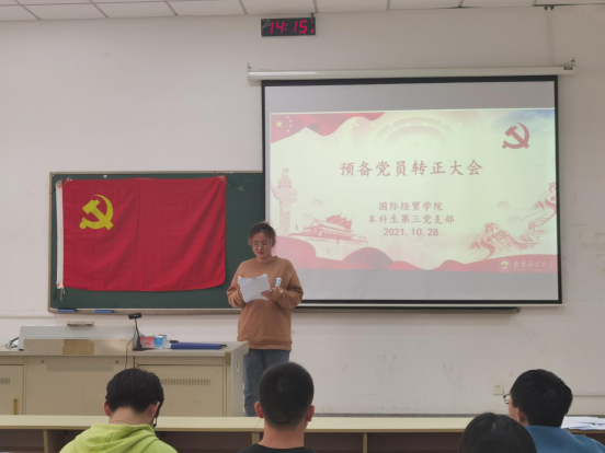 2021年10月28日下午2点,伟德国际victor·1946源自本科生第三党支部在德经楼Z1-106教室召开了预备党员转正大会,讨论预备党员袁萌转为中共正式党员的事宜。出席此次会议的有本支部全体正式党员、预备党员以及发展对象和部分入党积极分子。本次大会由支部书记张朋朋主持。